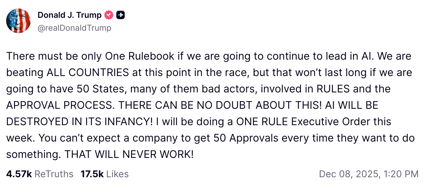 The Recap: President Trump confirmed he will sign an executive order to create a single federal framework for AI regulation, effectively preempting states from creating their own rules. He announced his plan on Truth Social, arguing a unified approach is essential to prevent AI from being “destroyed in its infancy.”
